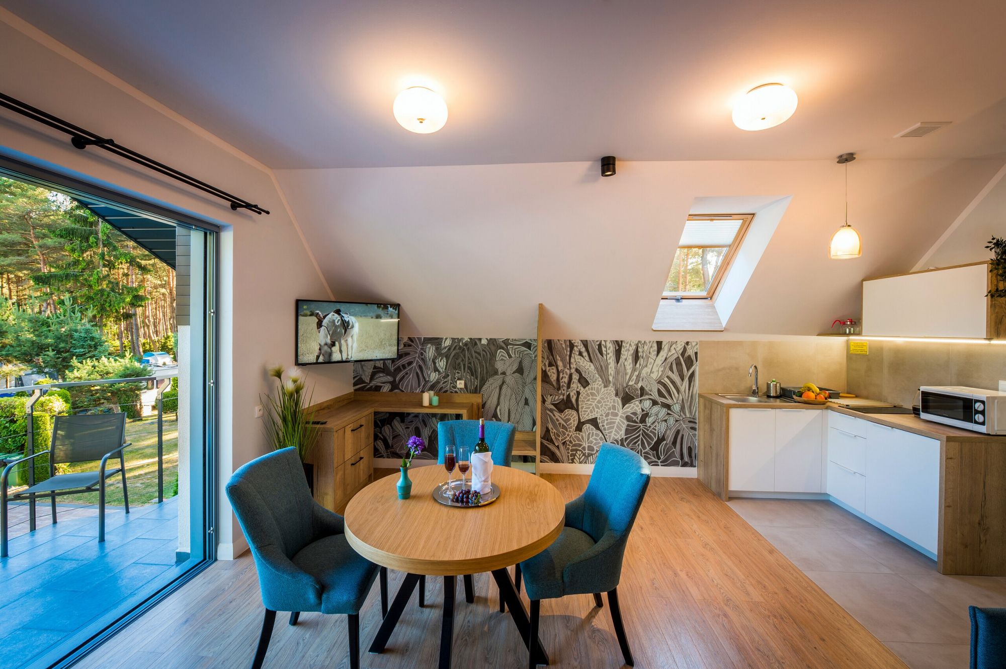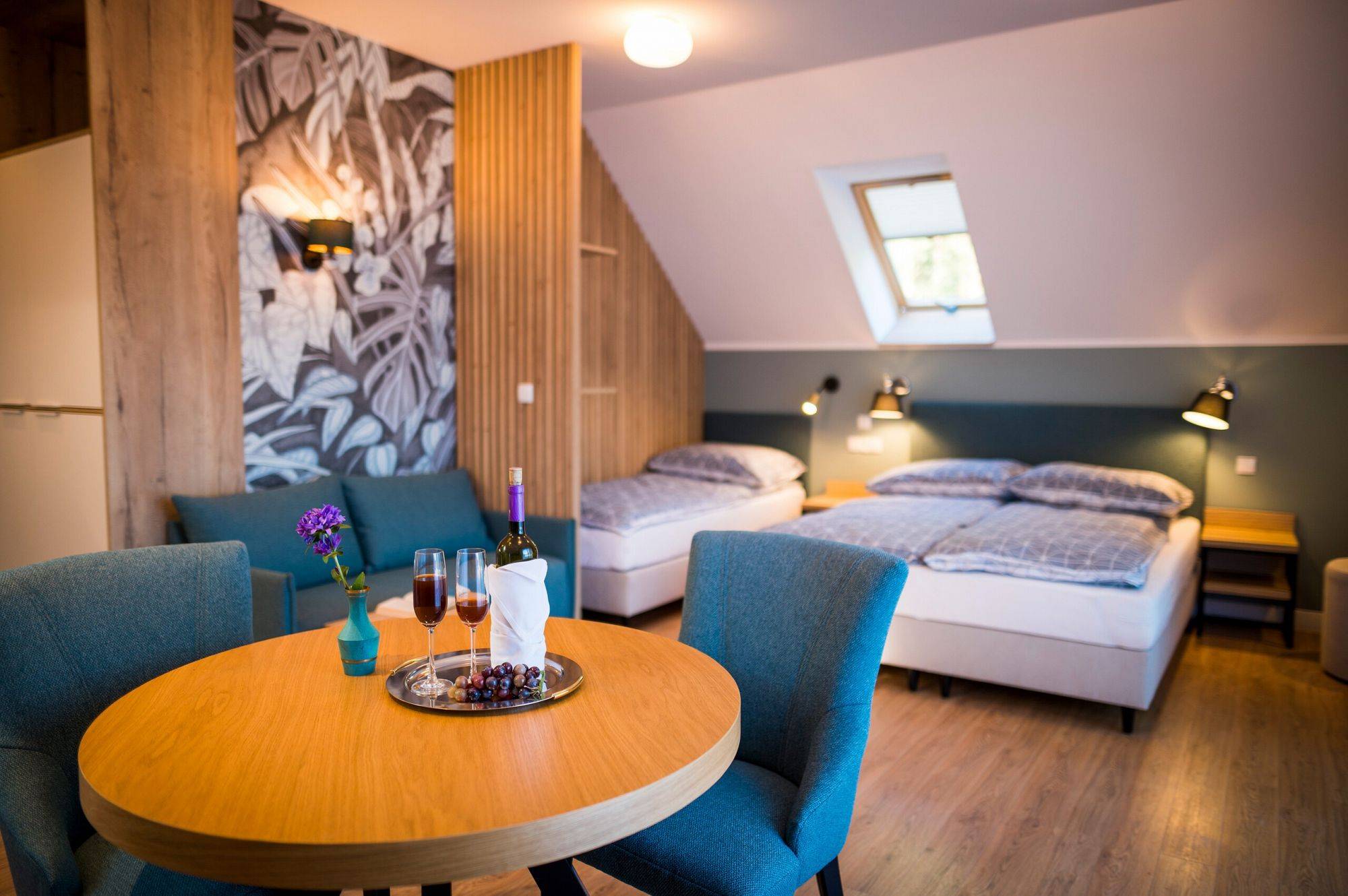 Część hotelową stanowią apartamenty oraz pokoje, zaprojektowane tak, aby uczynić Państwa pobyt jak najbardziej wygodnym. Posiadamy w swojej ofercie: 4 apartamenty dwupoziomowe z salonem, WC, łazienką, sypialnią, kuchnią i tarasem wypoczynkowym; 2 apartamenty znajdujące się na piętrze z balkonem, aneksem kuchennym, częścią sypialną i łazienką oraz 2 pokoje z TV, łazienką i aneksem kuchennym.