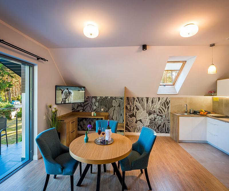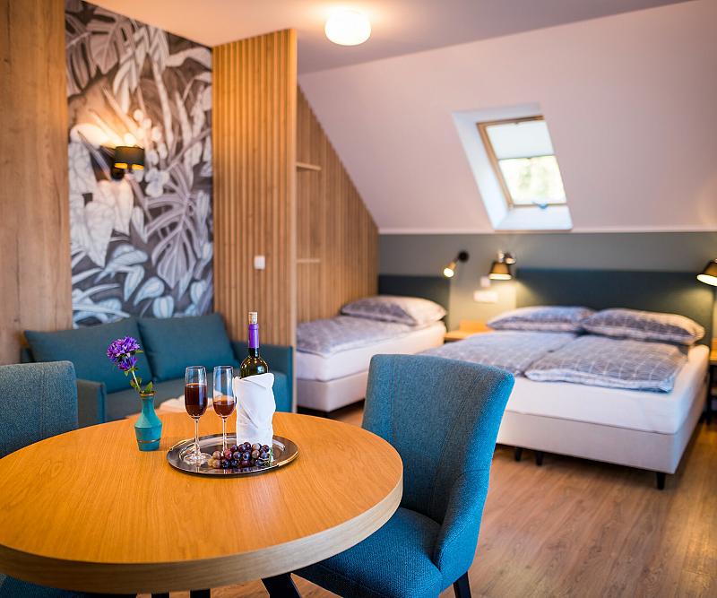 Część hotelową stanowią apartamenty oraz pokoje, zaprojektowane tak, aby uczynić Państwa pobyt jak najbardziej wygodnym. Posiadamy w swojej ofercie: 4 apartamenty dwupoziomowe z salonem, WC, łazienką, sypialnią, kuchnią i tarasem wypoczynkowym; 2 apartamenty znajdujące się na piętrze z balkonem, aneksem kuchennym, częścią sypialną i łazienką oraz 2 pokoje z TV, łazienką i aneksem kuchennym.
